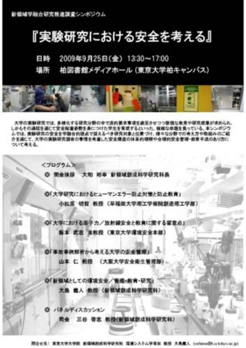 大学での安全な実験を考えるシンポジウムが下記のように東大・柏キャンパスで開催されます。 入場無料、どなたでもご参加いただけます。新領域学融合研究推進調査シンポジウム『実験研究における安全を考える』 日時2009年9月25日(金) 13:30〜17:00 場所柏…