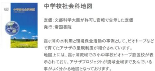 アサザ基金ホームページの2011年6月10日記事に「帝国書院の「中学校社会科地図」にアサザプロジェクトが紹介されています。 」とあります。そこをクリックすると下記の紹介があります。 現時点でのURLはhttp://www.kasumigaura.net/asaza/01about/03media/bo…